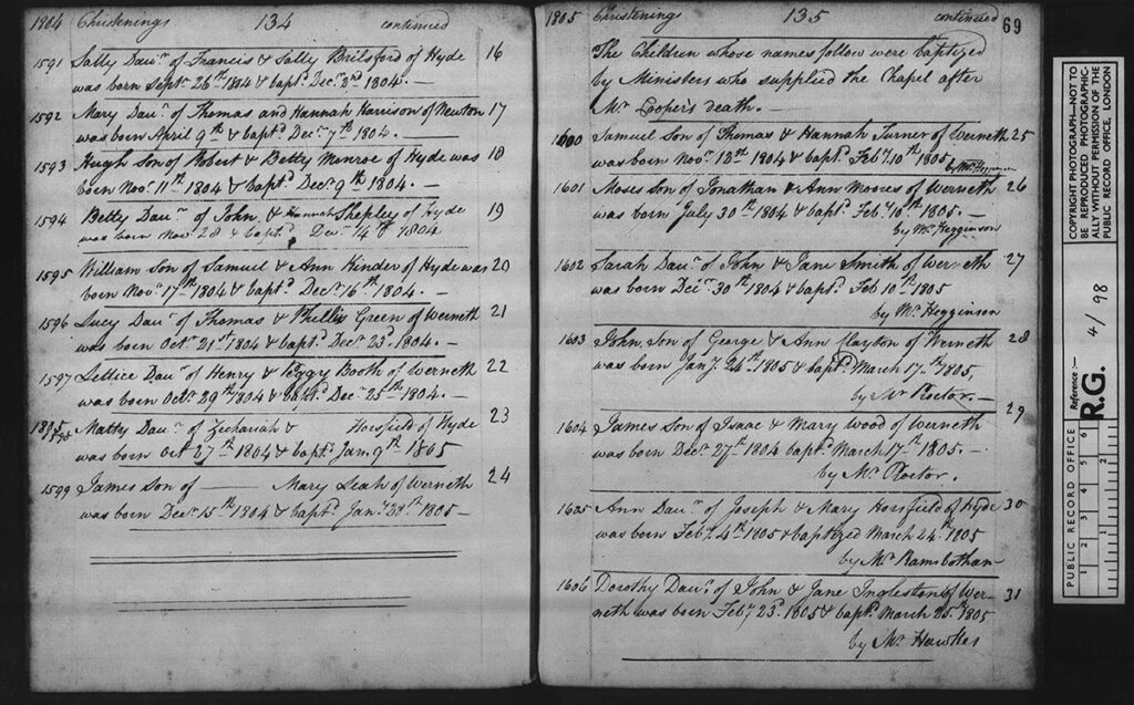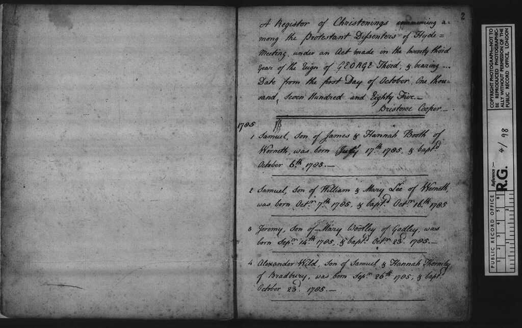 “A Register of Christenings commencing among the Protestant Dissenters of Hyde Meeting, under an Act made in the twenty third year of the reign of GEORGE Third, & bearing… Date from the first Day of October, One thousand, Seven Hundred and Eighty Five._