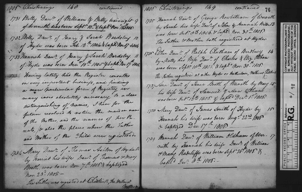 “Having lately had the Register consulted on very important business, and finding a more particular form of Registry in many cases absolutely necessary to a clear distinguishing of names, I have for the future resolved to notice the maiden name of the mother, and the names of her Parents, & also the places where the father and mother of the child were registered.”
