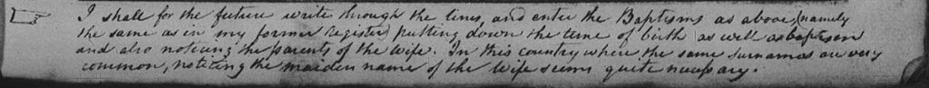 “I shall for the future write through the lines, and enter the Baptisms as above (namely the same as in my former register) putting down the time of birth as well as baptism and also noticing the parents of the wife. In this country where the same surnames are very common, noticing the maiden name of the wife & comes quite necessary.”